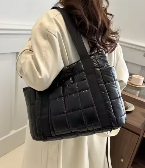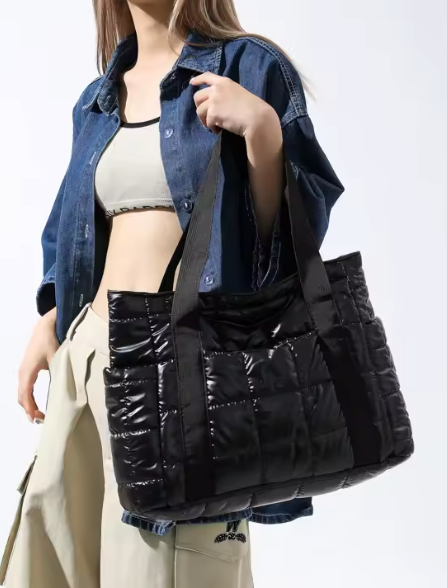 The Galaxy Tote blends function with a quietly striking aesthetic. Designed in lustrous quilted nylon, its structured shape and generous compartments make it an effortless companion for both city days and weekend escapes. Understated, yet undeniably modern — it redefines everyday carry.