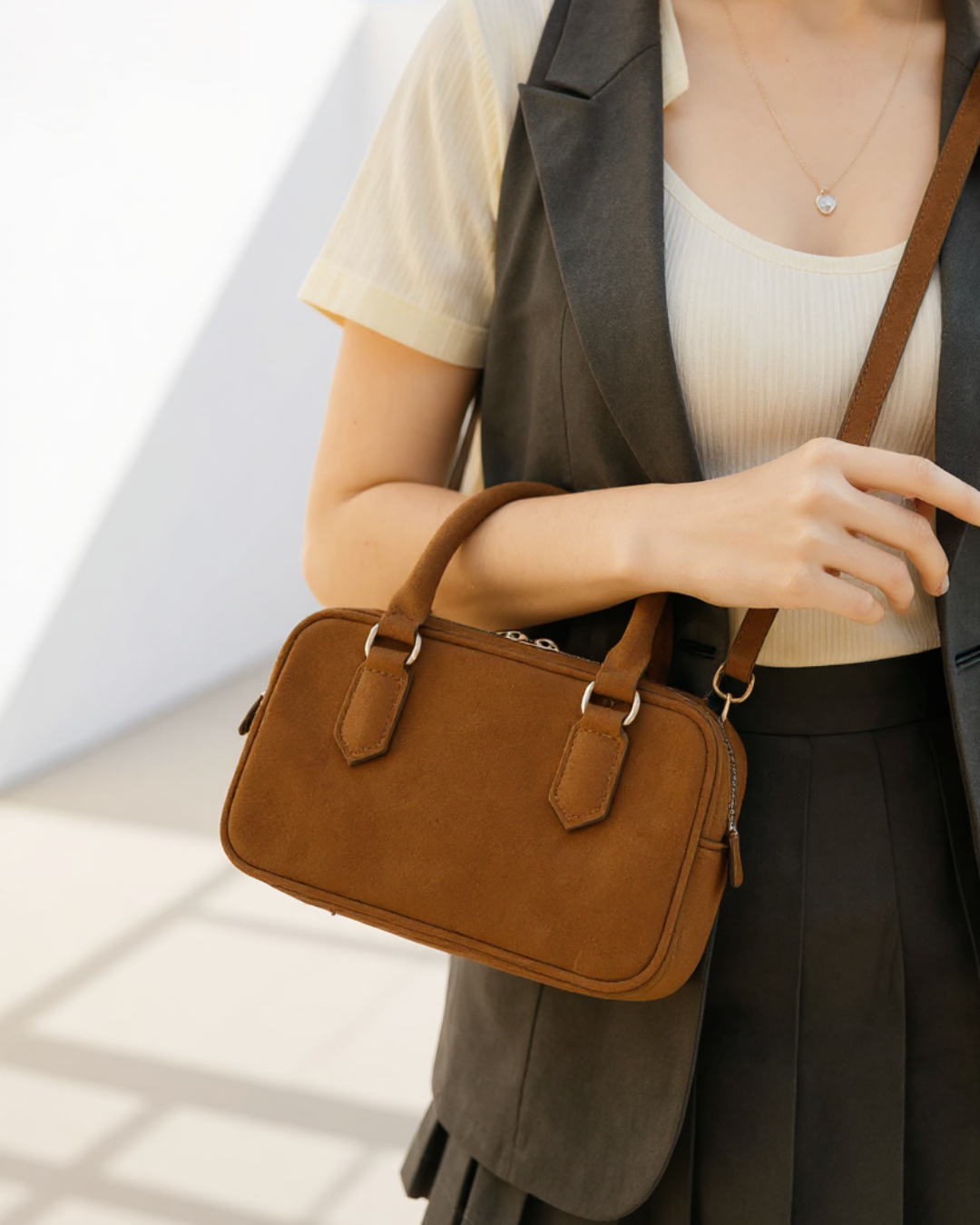 Introducing the Serphina 2.0 — a refined box silhouette reimagined in plush suede over genuine leather for a soft, tactile finish. Accented with gold-tone hardware and available in two versatile sizes, it blends timeless form with quiet sophistication. Whether carried by hand or styled crossbody, Serphina 2.0 is an effortlessly elegant staple for elevated days.